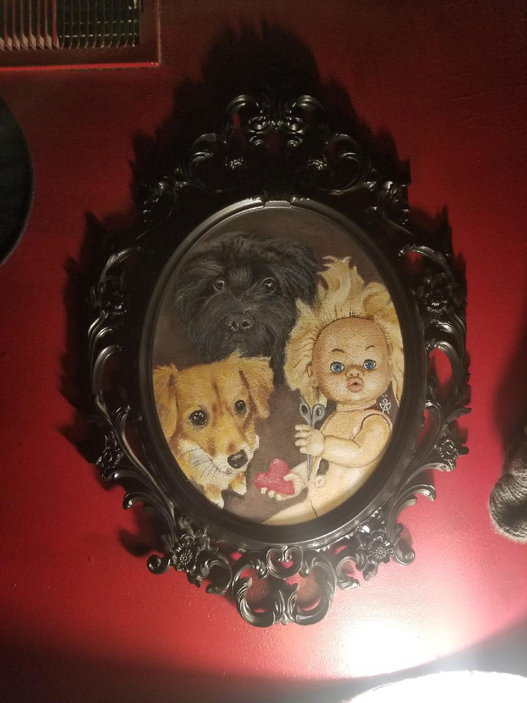 Commissioned to paint the 2 dogs with creative freedom, doll with scissors added for fun (client is a hairstylist)