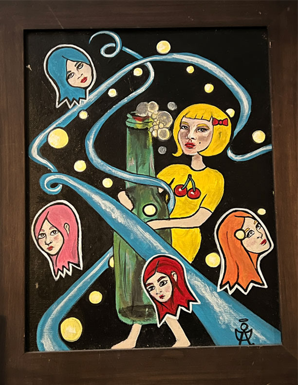 In the song "Mercy," Pusha T says something about "Ms. Pac-man, this pill poppin' ass hoe." It made me laugh because is that what Pac-man is really about? So, I painted Ms. Pac-man and her homegirls. The heads are supposed to be the ghosts in the game which is why they all have corresponding hair colors.