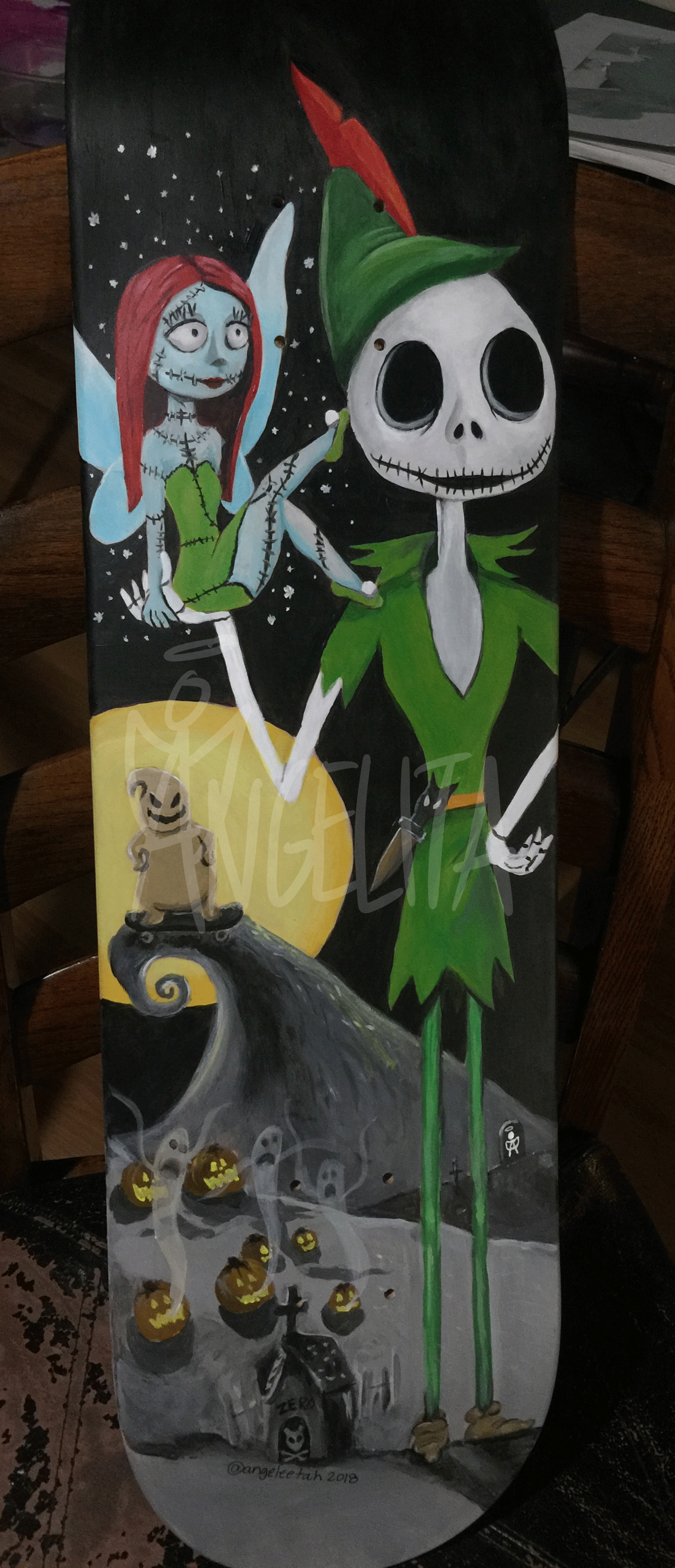 Jack and Sally as a Peter Pan and Tinkerbell Mashup. Original artist concept and execution. Painted with acrylic paints.