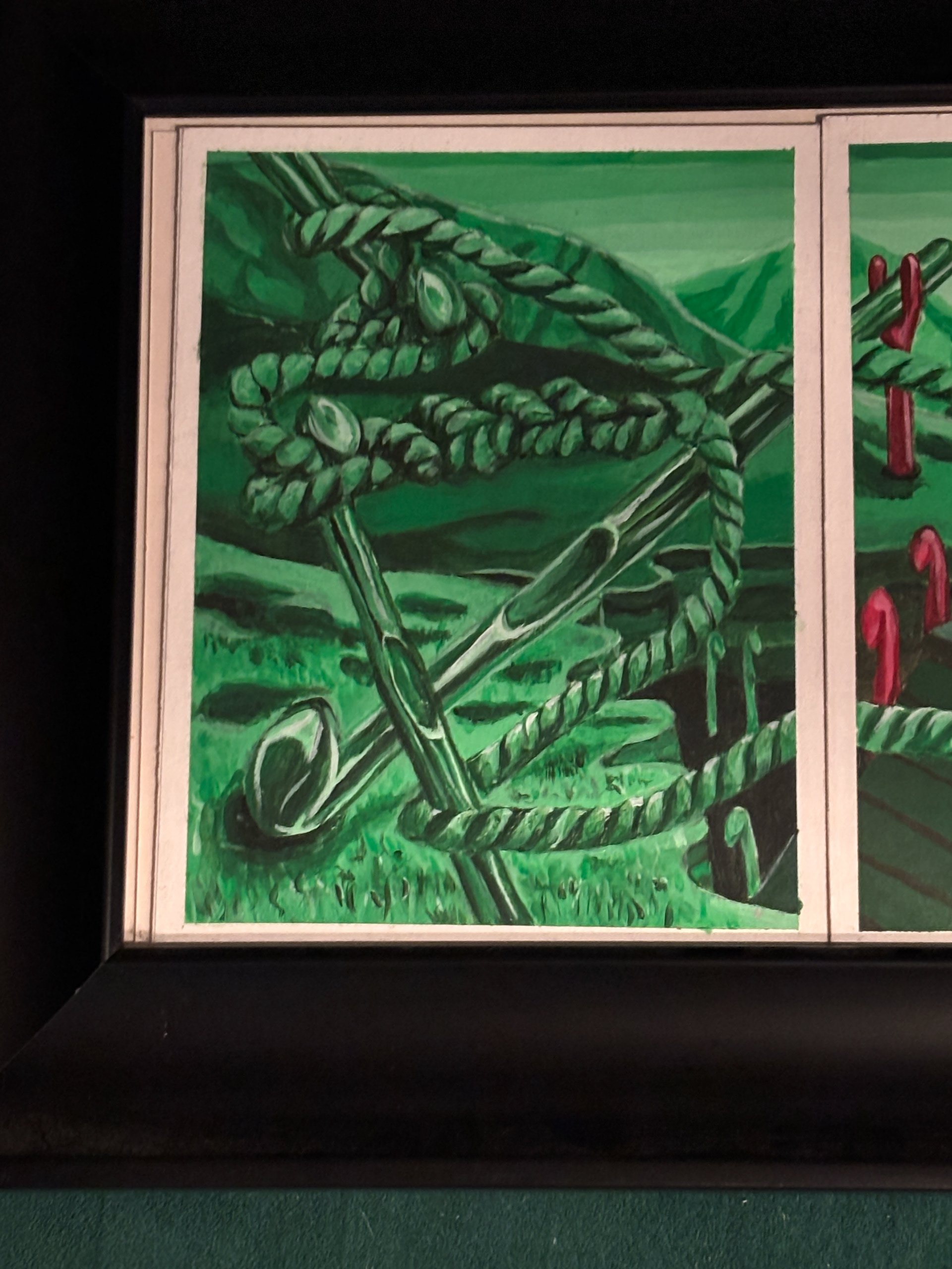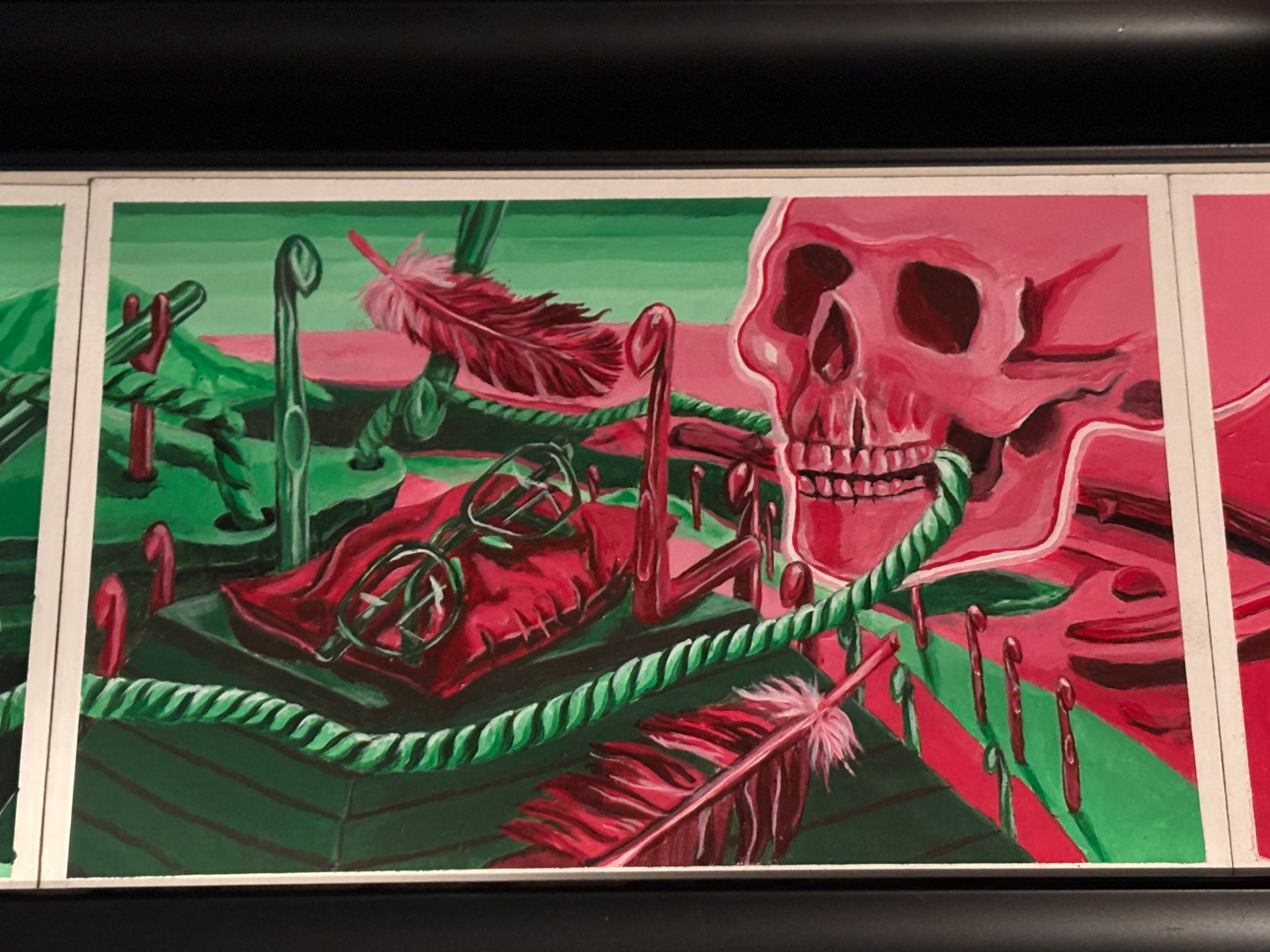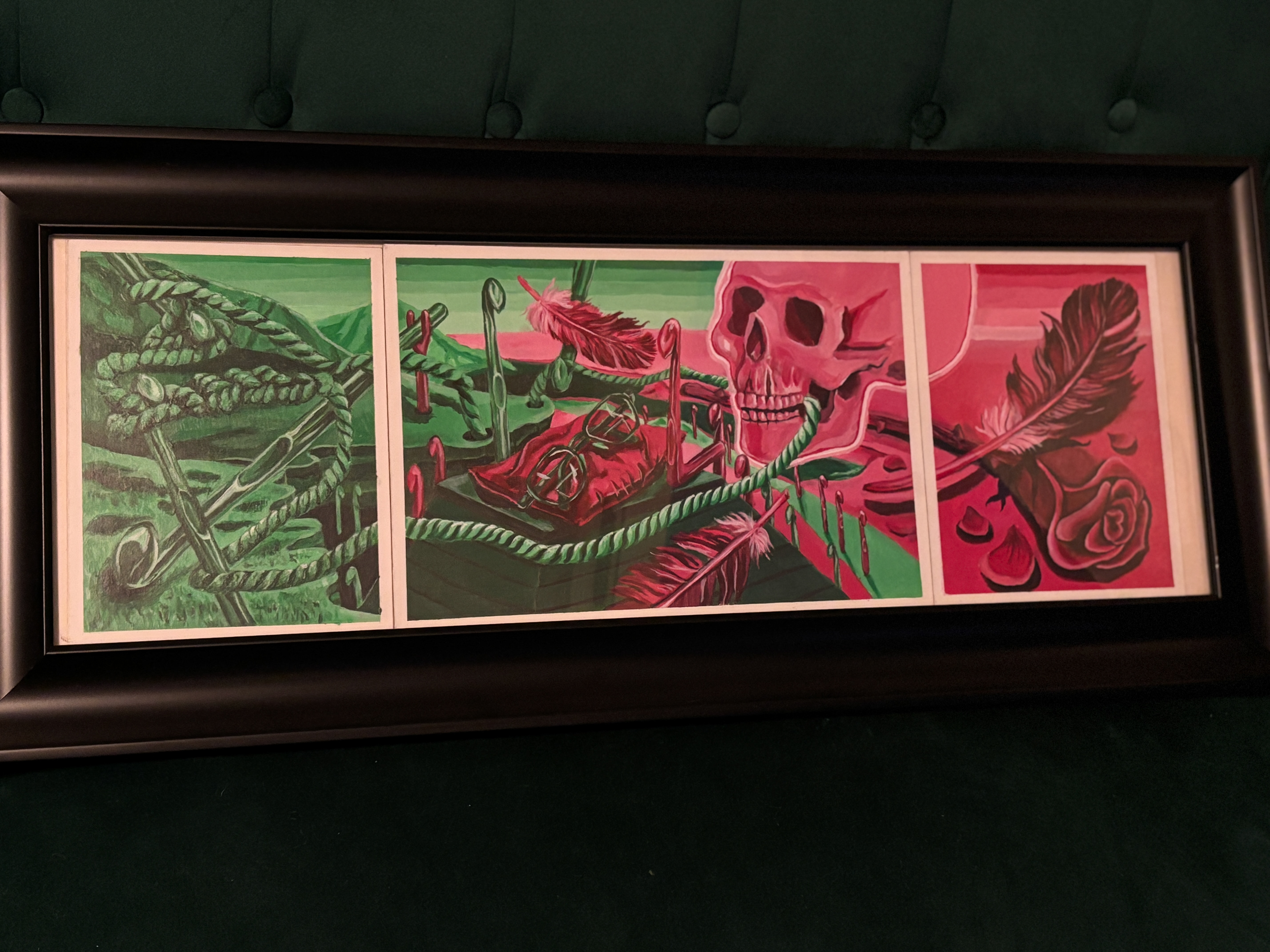 My grandma used to crochet blankets. Every time someone became pregnant, my grandma would ask me to take her to Michael's to pick out Red Heart yarn so that she could create a new blanket. I spent a lot of time with her. We often went to funerals together. Her death inspired this painting, made with honor and with love, just like her blankets. Although I don't do it anymore, I know how to crochet because of her. This triptych painting is not only a tribute to her, but to life and death itself.